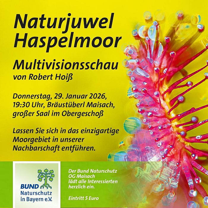 Der Verein Lebensraum Haspelmoor hat es sich zur Aufgabe gemacht, den Bewohnern der Dörfer um das Haspelmoor dessen einzigartige Natur, Geschichte und Kunst vermitteln und die Menschen dafür begeistern, diesen Naturraum zu schützen und zu bewahren. Die Ortsgruppe Maisach des Bund Naturschutz lädt alle Interessierten herzlich ein, das „Naturjuwel Haspelmoor“ in einer einzigartigen Multivisionsschau des Naturfotografen Robert Hoiß zu entdecken.
